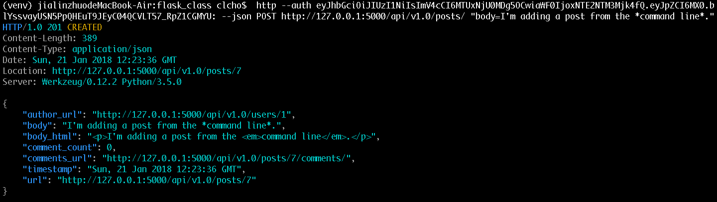 (venv) $ http --auth <token>: --json POST http://127.0.0.1:5000/api/v1.0/posts/ "body=I'm adding a post from the *command line*."